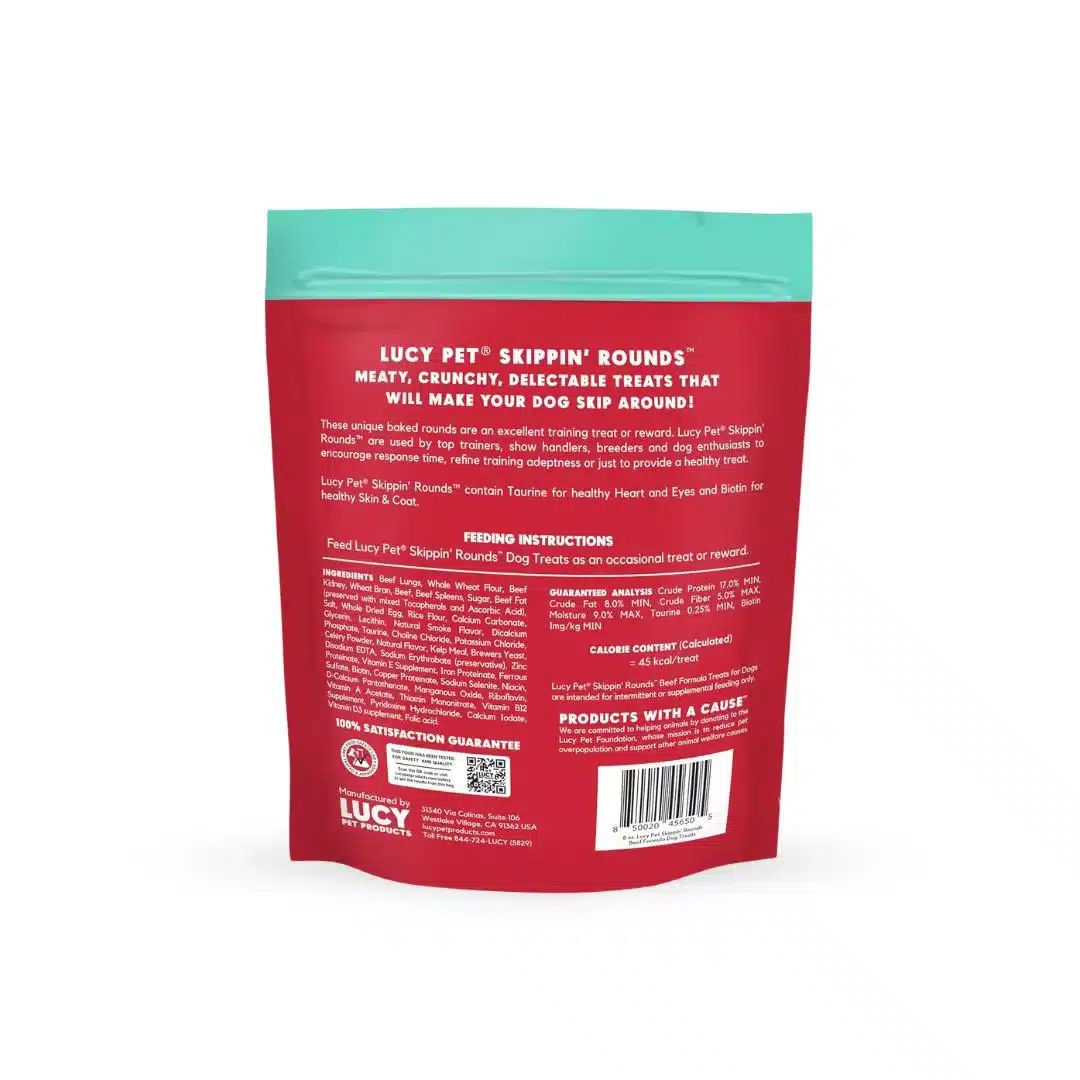 Lucy Pet® Skippin’ Rounds™ are an excellent training treat or reward used by top trainers, show handlers, breeders, and dog enthusiasts to encourage response time, refine training adeptness, or to provide a healthy treat. Lucy Pet® Skippin’ Rounds™ contains Taurine for Healthy Heart and Eyes and Biotin for Healthy Skin & Coat.