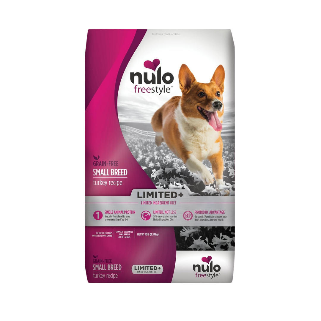 Nulo Freestyle Small Breed Turkey – 10 lb – Our FreeStyle Limited+ Small Breed Turkey recipe is a higher protein, lower carb recipe specially formulated for dogs preferring a simplified diet. A limited ingredient diet is great for pets with food sensitivities. Plus, our Turkey recipe contains the patented probiotic GanedenBC30, the first of its kind to survive the cooking and extrusion process that occurs when making kibble. This means the probiotic is making its way straight to your pup’s bowl to help them with gut and digestive health! With 57% of an 8 oz cup coming straight from turkey and turkey meal – your dog isn’t going to be able to resist mealtime!